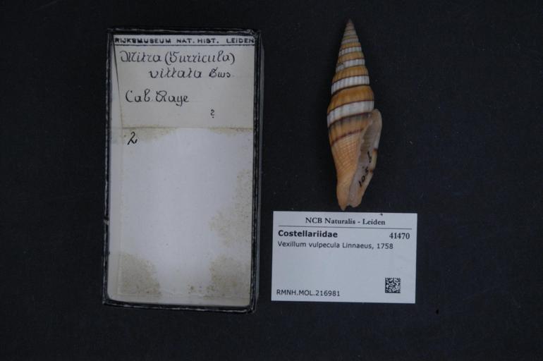 | Keywords: Naturalis Biodiversity Center - RMNH.MOL.216981 - Vexillum vulpecula (Linnaeus, 1758) - Costellariidae - Mollusc shell.jpeg artwork Dimensions artwork Document type Costellariidae Vexillum Individual count Infraspecific epithet Infraspecific rank Institution Naturalis Kind of unit artwork Kind of unit specimen shell Life stage Medium artwork Nomenclatural code Source institute Rijksmuseum van Natuurlijke Historie Leiden Scale the width of the text on the species/QR-code label is 38 mm Occurrence ID page Neogastropoda Other fields Other versions artwork Permission license Naturalis donation CC-0 Mollusca Publication location Scientific name Vexillum vulpecula Linnaeus 1758 Scientific name authorship Linnaeus 1758 Source url http //bioportal naturalis nl Specific epithet vulpecula State or province Subject keywords artwork Subject keywords publication Title artwork Title publication Type status Uploaded with GWToolset Naturalis_Biodiversity_Center_-_RMNH MOL 216981_-_Vexillum_vulpecula_ Linnaeus _1758 _-_Costellariidae_-_Mollusc_shell http //medialib naturalis nl/file/id/RMNH MOL 216981/format/large Molluscs at Naturalis from the Rijksmuseum van Natuurlijke Historie Media donated by Naturalis Biodiversity Center Vexillum vulpecula Vexillum |