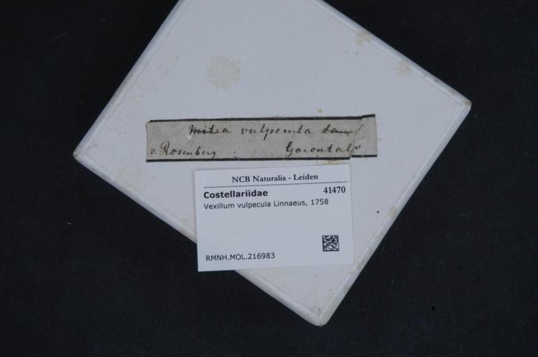 | Keywords: Naturalis Biodiversity Center - RMNH.MOL.216983 1 - Vexillum vulpecula (Linnaeus, 1758) - Costellariidae - Mollusc shell.jpeg artwork Dimensions artwork Document type Costellariidae Vexillum Individual count Infraspecific epithet Infraspecific rank Institution Naturalis Kind of unit artwork Kind of unit specimen shell Life stage Medium artwork Nomenclatural code Source institute Rijksmuseum van Natuurlijke Historie Leiden Scale the width of the text on the species/QR-code label is 38 mm Occurrence ID page Neogastropoda Other fields Other versions artwork Permission license Naturalis donation CC-0 Mollusca Publication location Scientific name Vexillum vulpecula Linnaeus 1758 Scientific name authorship Linnaeus 1758 Source url http //bioportal naturalis nl Specific epithet vulpecula State or province Subject keywords artwork Subject keywords publication Title artwork Title publication Type status Uploaded with GWToolset Naturalis_Biodiversity_Center_-_RMNH MOL 216983_1_-_Vexillum_vulpecula_ Linnaeus _1758 _-_Costellariidae_-_Mollusc_shell http //medialib naturalis nl/file/id/RMNH MOL 216983_1/format/large Molluscs at Naturalis from the Rijksmuseum van Natuurlijke Historie Media donated by Naturalis Biodiversity Center Vexillum vulpecula Vexillum |