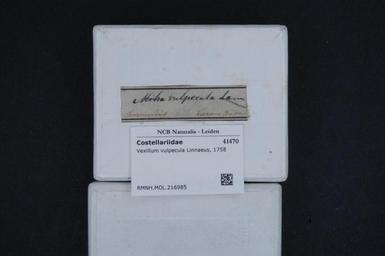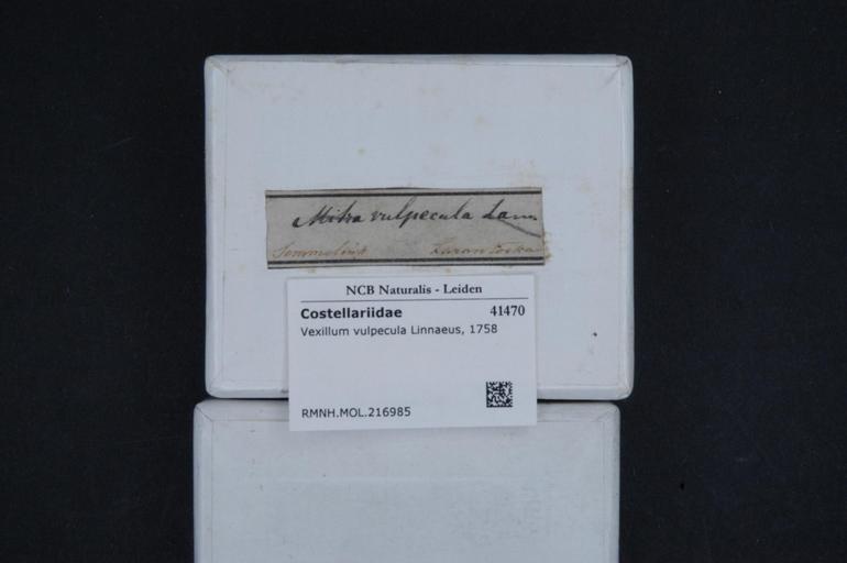| Keywords: Naturalis Biodiversity Center - RMNH.MOL.216985 1 - Vexillum vulpecula (Linnaeus, 1758) - Costellariidae - Mollusc shell.jpeg artwork Dimensions artwork Document type Costellariidae Vexillum Individual count Infraspecific epithet Infraspecific rank Institution Naturalis Kind of unit artwork Kind of unit specimen shell Life stage Medium artwork Nomenclatural code Source institute Rijksmuseum van Natuurlijke Historie Leiden Scale the width of the text on the species/QR-code label is 38 mm Occurrence ID page Neogastropoda Other fields Other versions artwork Permission license Naturalis donation CC-0 Mollusca Publication location Scientific name Vexillum vulpecula Linnaeus 1758 Scientific name authorship Linnaeus 1758 Source url http //bioportal naturalis nl Specific epithet vulpecula State or province Subject keywords artwork Subject keywords publication Title artwork Title publication Type status Uploaded with GWToolset Naturalis_Biodiversity_Center_-_RMNH MOL 216985_1_-_Vexillum_vulpecula_ Linnaeus _1758 _-_Costellariidae_-_Mollusc_shell http //medialib naturalis nl/file/id/RMNH MOL 216985_1/format/large Molluscs at Naturalis from the Rijksmuseum van Natuurlijke Historie Media donated by Naturalis Biodiversity Center Vexillum vulpecula Vexillum |