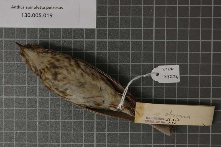 | Keywords: Naturalis Biodiversity Center - RMNH.AVES.123234 2 - Anthus spinoletta petrosus (Montagu, 1798) - Motacillidae - bird skin specimen.jpeg artwork Dimensions artwork Document type Motacillidae Anthus Individual count 1 Infraspecific epithet petrosus Infraspecific rank Institution Naturalis Kind of unit artwork Kind of unit specimen skin Life stage Halland Medium artwork Nomenclatural code Additional info GK Occurrence ID page Other fields Other versions artwork Permission license Naturalis donation CC-0 Publication location Scientific name Anthus spinoletta petrosus Montagu 1798 Scientific name authorship Montagu 1798 male Source url http //bioportal naturalis nl Specific epithet spinoletta State or province Halland Subject keywords artwork Subject keywords publication Title artwork Title publication Type status Uploaded with GWToolset Naturalis_Biodiversity_Center_-_RMNH AVES 123234_2_-_Anthus_spinoletta_petrosus_ Montagu _1798 _-_Motacillidae_-_bird_skin_specimen http //medialib naturalis nl/file/id/RMNH AVES 123234_2/format/large Media donated by Naturalis Biodiversity Center Songbird specimens at Naturalis Biodiversity Center Anthus petrosus museum specimens |