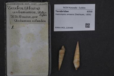 | Keywords: Naturalis Biodiversity Center - RMNH.MOL.226488 - Hastulopsis amoena (Deshayes, 1859) - Terebridae - Mollusc shell.jpeg artwork Dimensions artwork Document type Terebridae Hastulopsis Individual count Infraspecific epithet Infraspecific rank Institution Naturalis Kind of unit artwork Kind of unit specimen shell Life stage Medium artwork Nomenclatural code Source institute Rijksmuseum van Natuurlijke Historie Leiden Scale the width of the text on the species/QR-code label is 38 mm Occurrence ID page Other fields Other versions artwork Permission license Naturalis donation CC-0 Mollusca Publication location Scientific name Hastulopsis amoena Deshayes 1859 Scientific name authorship Deshayes 1859 Source url http //bioportal naturalis nl Specific epithet amoena State or province Subject keywords artwork Subject keywords publication Title artwork Title publication Type status Uploaded with GWToolset Naturalis_Biodiversity_Center_-_RMNH MOL 226488_-_Hastulopsis_amoena_ Deshayes _1859 _-_Terebridae_-_Mollusc_shell http //medialib naturalis nl/file/id/RMNH MOL 226488/format/large Molluscs at Naturalis from the Rijksmuseum van Natuurlijke Historie Media donated by Naturalis Biodiversity Center Hastulopsis amoena Hastulopsis |