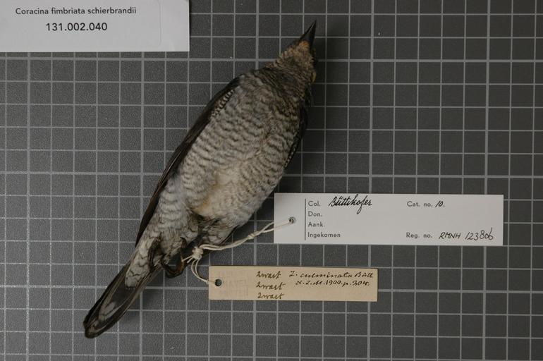 | Keywords: Naturalis Biodiversity Center - RMNH.AVES.123806 2 - Coracina fimbriata schierbrandii (Pelzeln, 1865) - Campephagidae - bird skin specimen.jpeg artwork Dimensions artwork Document type Campephagidae Coracina Individual count 1 Infraspecific epithet schierbrandii Infraspecific rank Institution Naturalis Kind of unit artwork Kind of unit specimen skin Life stage Indonesia Borneo Kapuas Smitau Medium artwork Nomenclatural code Occurrence ID page Other fields Other versions artwork Permission license Naturalis donation CC-0 Publication location Scientific name Coracina fimbriata schierbrandii Pelzeln 1865 Scientific name authorship Pelzeln 1865 female Source url http //bioportal naturalis nl Specific epithet fimbriata State or province Borneo Kapuas Subject keywords artwork Subject keywords publication Title artwork Title publication Type status Uploaded with GWToolset Naturalis_Biodiversity_Center_-_RMNH AVES 123806_2_-_Coracina_fimbriata_schierbrandii_ Pelzeln _1865 _-_Campephagidae_-_bird_skin_specimen http //medialib naturalis nl/file/id/RMNH AVES 123806_2/format/large Media donated by Naturalis Biodiversity Center Songbird specimens at Naturalis Biodiversity Center Coracina fimbriata schierbrandii |
