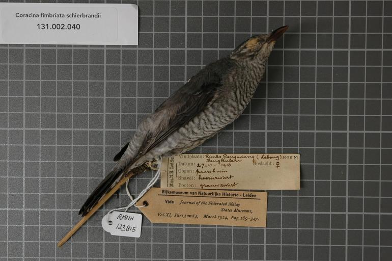 | Keywords: Naturalis Biodiversity Center - RMNH.AVES.123815 1 - Coracina fimbriata schierbrandii (Pelzeln, 1865) - Campephagidae - bird skin specimen.jpeg artwork Dimensions artwork Document type Campephagidae Coracina Individual count 1 Infraspecific epithet schierbrandii Infraspecific rank Institution Naturalis Kind of unit artwork Kind of unit specimen skin Life stage Bengkulen Rimbo Pengadang Lebong Medium artwork Nomenclatural code Occurrence ID page Other fields Other versions artwork Permission license Naturalis donation CC-0 Publication location Scientific name Coracina fimbriata schierbrandii Pelzeln 1865 Scientific name authorship Pelzeln 1865 female Source url http //bioportal naturalis nl Specific epithet fimbriata State or province Bengkulen Subject keywords artwork Subject keywords publication Title artwork Title publication Type status Uploaded with GWToolset Naturalis_Biodiversity_Center_-_RMNH AVES 123815_1_-_Coracina_fimbriata_schierbrandii_ Pelzeln _1865 _-_Campephagidae_-_bird_skin_specimen http //medialib naturalis nl/file/id/RMNH AVES 123815_1/format/large Media donated by Naturalis Biodiversity Center Songbird specimens at Naturalis Biodiversity Center Coracina fimbriata schierbrandii |