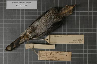 | Keywords: Naturalis Biodiversity Center - RMNH.AVES.123826 2 - Coracina fimbriata compta (Richmond, 1903) - Campephagidae - bird skin specimen.jpeg artwork Dimensions artwork Document type Campephagidae Coracina Individual count 1 Infraspecific epithet compta Infraspecific rank Institution Naturalis Kind of unit artwork Kind of unit specimen skin Life stage Zuid Simalur Ajer Dingin Medium artwork Nomenclatural code Occurrence ID page Other fields Other versions artwork Permission license Naturalis donation CC-0 Publication location Scientific name Coracina fimbriata compta Richmond 1903 Scientific name authorship Richmond 1903 female Source url http //bioportal naturalis nl Specific epithet fimbriata State or province Zuid Simalur Subject keywords artwork Subject keywords publication Title artwork Title publication Type status Uploaded with GWToolset Naturalis_Biodiversity_Center_-_RMNH AVES 123826_2_-_Coracina_fimbriata_compta_ Richmond _1903 _-_Campephagidae_-_bird_skin_specimen http //medialib naturalis nl/file/id/RMNH AVES 123826_2/format/large Media donated by Naturalis Biodiversity Center Songbird specimens at Naturalis Biodiversity Center Coracina fimbriata compta |