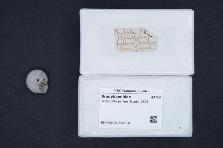 | Keywords: Naturalis Biodiversity Center - RMNH.MOL.308110 1 - Trishoplita pallens Jacobi, 1898 - Bradybaenidae - Mollusc shell.jpeg artwork Dimensions artwork Document type Bradybaenidae Trishoplita Individual count Infraspecific epithet Infraspecific rank Institution Naturalis Kind of unit artwork Kind of unit specimen shell Life stage Medium artwork Nomenclatural code Source institute Rijksmuseum van Natuurlijke Historie Leiden Scale the width of the text on the species/QR-code label is 38 mm Occurrence ID page Other fields Other versions artwork Permission license Naturalis donation CC-0 Mollusca Publication location Scientific name Trishoplita pallens Jacobi 1898 Scientific name authorship Jacobi 1898 Source url http //bioportal naturalis nl Specific epithet pallens State or province Subject keywords artwork Subject keywords publication Title artwork Title publication Type status Uploaded with GWToolset Naturalis_Biodiversity_Center_-_RMNH MOL 308110_1_-_Trishoplita_pallens_Jacobi _1898_-_Bradybaenidae_-_Mollusc_shell http //medialib naturalis nl/file/id/RMNH MOL 308110_1/format/large Media donated by Naturalis Biodiversity Center Molluscs at Naturalis from the Rijksmuseum van Natuurlijke Historie Trishoplita pallens Trishoplita |