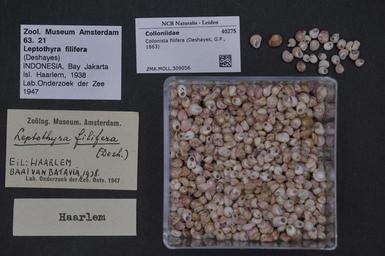 | Keywords: Naturalis Biodiversity Center - ZMA.MOLL.309056 - Collonista filifera (Deshayes, G.P., 1863) - Colloniidae - Mollusc shell.jpeg artwork Dimensions artwork Document type Colloniidae Collonista Individual count Infraspecific epithet Infraspecific rank Institution Naturalis Kind of unit artwork Kind of unit specimen shell Life stage Medium artwork Nomenclatural code Source institute Zoölogisch Museum Amsterdam Scale the width of the text on the species/QR-code label is 38 mm Occurrence ID page Other fields Other versions artwork Permission license Naturalis donation CC-0 Mollusca Publication location Scientific name Collonista filifera Deshayes G P 1863 Scientific name authorship Deshayes 1863 Source url http //bioportal naturalis nl Specific epithet filifera State or province Subject keywords artwork Subject keywords publication Title artwork Title publication Type status Uploaded with GWToolset Naturalis_Biodiversity_Center_-_ZMA MOLL 309056_-_Collonista_filifera_ Deshayes _G P _1863 _-_Colloniidae_-_Mollusc_shell http //medialib naturalis nl/file/id/ZMA MOLL 309056/format/large Media donated by Naturalis Biodiversity Center Molluscs at Naturalis from the Zoölogisch Museum Amsterdam Collonista filifera Collonista |