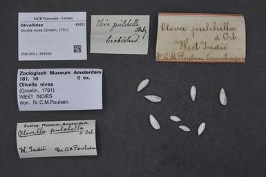 | Keywords: Naturalis Biodiversity Center - ZMA.MOLL.359300 - Olivella nivea (Gmelin, 1791) - Olivellidae - Mollusc shell.jpeg artwork Dimensions artwork Document type Olivellidae Olivella Individual count Infraspecific epithet Infraspecific rank Institution Naturalis Kind of unit artwork Kind of unit specimen shell Life stage Medium artwork Nomenclatural code Source institute Zoölogisch Museum Amsterdam Scale the width of the text on the species/QR-code label is 38 mm Occurrence ID page Other fields Other versions artwork Permission license Naturalis donation CC-0 Mollusca Publication location Scientific name Olivella nivea Gmelin 1791 Scientific name authorship Gmelin 1791 Source url http //bioportal naturalis nl Specific epithet nivea State or province Subject keywords artwork Subject keywords publication Title artwork Title publication Type status Uploaded with GWToolset Naturalis_Biodiversity_Center_-_ZMA MOLL 359300_-_Olivella_nivea_ Gmelin _1791 _-_Olivellidae_-_Mollusc_shell http //medialib naturalis nl/file/id/ZMA MOLL 359300/format/large Media donated by Naturalis Biodiversity Center Molluscs at Naturalis from the Zoölogisch Museum Amsterdam Olivella nivea Olivella |