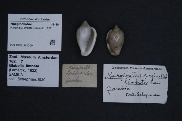 | Keywords: Naturalis Biodiversity Center - ZMA.MOLL.361300 - Marginella limbata Lamarck, 1822 - Marginellidae - Mollusc shell.jpeg artwork Dimensions artwork Document type Marginellidae Marginella Individual count Infraspecific epithet Infraspecific rank Institution Naturalis Kind of unit artwork Kind of unit specimen shell Life stage Medium artwork Nomenclatural code Source institute Zoölogisch Museum Amsterdam Scale the width of the text on the species/QR-code label is 38 mm Occurrence ID page Neogastropoda Other fields Other versions artwork Permission license Naturalis donation CC-0 Mollusca Publication location Scientific name Marginella limbata Lamarck 1822 Scientific name authorship Lamarck 1822 Source url http //bioportal naturalis nl Specific epithet limbata State or province Subject keywords artwork Subject keywords publication Title artwork Title publication Type status Uploaded with GWToolset Naturalis_Biodiversity_Center_-_ZMA MOLL 361300_-_Marginella_limbata_Lamarck _1822_-_Marginellidae_-_Mollusc_shell http //medialib naturalis nl/file/id/ZMA MOLL 361300/format/large Media donated by Naturalis Biodiversity Center Molluscs at Naturalis from the Zoölogisch Museum Amsterdam Marginella limbata Marginella |