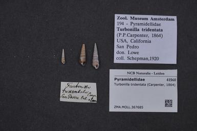 | Keywords: Naturalis Biodiversity Center - ZMA.MOLL.367685 - Turbonilla tridentata (Carpenter, 1864) - Pyramidellidae - Mollusc shell.jpeg artwork Dimensions artwork Document type Pyramidellidae subfamily Turbonillinae Turbonilla Individual count Infraspecific epithet Infraspecific rank Institution Naturalis Kind of unit artwork Kind of unit specimen shell Life stage Medium artwork Nomenclatural code Source institute Zoölogisch Museum Amsterdam Scale the width of the text on the species/QR-code label is 38 mm Occurrence ID page Other fields Other versions artwork Permission license Naturalis donation CC-0 Mollusca Publication location Scientific name Turbonilla tridentata Carpenter 1864 Scientific name authorship Carpenter 1864 Source url http //bioportal naturalis nl Specific epithet tridentata State or province Subject keywords artwork Subject keywords publication Title artwork Title publication Type status Uploaded with GWToolset Naturalis_Biodiversity_Center_-_ZMA MOLL 367685_-_Turbonilla_tridentata_ Carpenter _1864 _-_Pyramidellidae_-_Mollusc_shell http //medialib naturalis nl/file/id/ZMA MOLL 367685/format/large Media donated by Naturalis Biodiversity Center Molluscs at Naturalis from the Zoölogisch Museum Amsterdam Turbonilla tridentata Turbonilla |