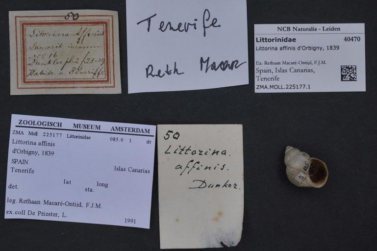 Keywords: Naturalis Biodiversity Center - ZMA.MOLL.225177.1 1 - Littorina affinis d'Orbigny, 1839 - Littorinidae - Mollusc shell.jpeg artwork Dimensions artwork Document type Littorinidae Littorina Individual count Infraspecific epithet Infraspecific rank Institution Naturalis Kind of unit artwork Kind of unit specimen shell Life stage Spain Islas Canarias Tenerife Medium artwork Nomenclatural code Collection remarks Moll Scale the width of the text on the species/QR-code label is 38 mm Occurrence ID page Other fields Other versions artwork Permission license Naturalis donation CC-0 Publication location Scientific name Littorina affinis d'Orbigny 1839 Scientific name authorship Source url http //bioportal naturalis nl Specific epithet affinis State or province Canary Islands Subject keywords artwork Subject keywords publication Title artwork Title publication Type status Uploaded with GWToolset Naturalis_Biodiversity_Center_-_ZMA MOLL 225177 1_1_-_Littorina_affinis_d'Orbigny _1839_-_Littorinidae_-_Mollusc_shell http //medialib naturalis nl/file/id/ZMA MOLL 225177 1_1/format/large Media donated by Naturalis Biodiversity Center Molluscs at Naturalis from the Zoölogisch Museum Amsterdam Littorina affinis Littorina