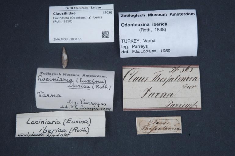 | Keywords: Naturalis Biodiversity Center - ZMA.MOLL.383156 - Euxinastra (Odonteuxina) iberica (Roth, 1850) - Clausiliidae - Mollusc shell.jpeg artwork Dimensions artwork Document type Clausiliidae subfamily Mentissoideinae Euxinastra Individual count Infraspecific epithet Infraspecific rank Institution Naturalis Kind of unit artwork Kind of unit specimen shell Life stage Medium artwork Nomenclatural code Source institute Rijksmuseum van Natuurlijke Historie Leiden Scale the width of the text on the species/QR-code label is 38 mm Occurrence ID page Other fields Other versions artwork Permission license Naturalis donation CC-0 Mollusca Publication location Scientific name Euxinastra Odonteuxina iberica Roth 1850 Scientific name authorship Roth 1850 Source url http //bioportal naturalis nl Specific epithet iberica State or province Subject keywords artwork Subject keywords publication Title artwork Title publication Type status Uploaded with GWToolset Naturalis_Biodiversity_Center_-_ZMA MOLL 383156_-_Euxinastra_ Odonteuxina _iberica_ Roth _1850 _-_Clausiliidae_-_Mollusc_shell http //medialib naturalis nl/file/id/ZMA MOLL 383156/format/large Molluscs at Naturalis from the Zoölogisch Museum Amsterdam Media donated by Naturalis Biodiversity Center Euxinastra iberica Euxinastra |