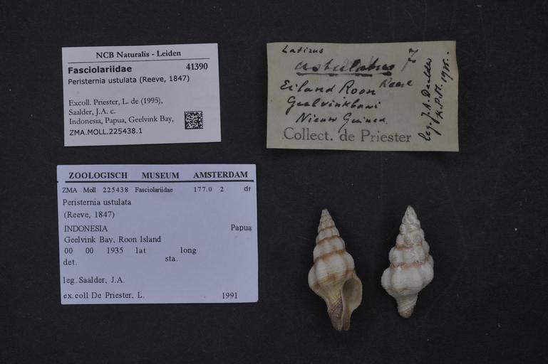| Keywords: Naturalis Biodiversity Center - ZMA.MOLL.225438.1 - Peristernia ustulata (Reeve, 1847) - Fasciolariidae - Mollusc shell.jpeg artwork Dimensions artwork Document type Fasciolariidae subfamily Peristerniinae Peristernia Individual count Infraspecific epithet Infraspecific rank Institution Naturalis Kind of unit artwork Kind of unit specimen shell Life stage Indonesia Papua Geelvink Bay Roon Island; 1935 Medium artwork Nomenclatural code Moll Scale the width of the text on the species/QR-code label is 38 mm Occurrence ID page Other fields Other versions artwork Permission license Naturalis donation CC-0 Mollusca Publication location Scientific name Peristernia ustulata Reeve 1847 Scientific name authorship Reeve 1847 Source url http //bioportal naturalis nl Specific epithet ustulata State or province Papua Subject keywords artwork Subject keywords publication Title artwork Title publication Type status Uploaded with GWToolset Naturalis_Biodiversity_Center_-_ZMA MOLL 225438 1_-_Peristernia_ustulata_ Reeve _1847 _-_Fasciolariidae_-_Mollusc_shell http //medialib naturalis nl/file/id/ZMA MOLL 225438 1/format/large Media donated by Naturalis Biodiversity Center Molluscs at Naturalis from the Zoölogisch Museum Amsterdam Peristernia ustulata Peristernia |