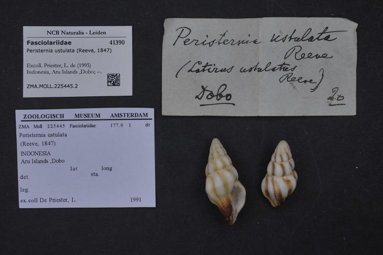 | Keywords: Naturalis Biodiversity Center - ZMA.MOLL.225445.2 - Peristernia ustulata (Reeve, 1847) - Fasciolariidae - Mollusc shell.jpeg artwork Dimensions artwork Document type Fasciolariidae subfamily Peristerniinae Peristernia Individual count Infraspecific epithet Infraspecific rank Institution Naturalis Kind of unit artwork Kind of unit specimen shell Life stage Indonesia Aru Islands Dobo Medium artwork Nomenclatural code Moll Scale the width of the text on the species/QR-code label is 38 mm Occurrence ID page Other fields Other versions artwork Permission license Naturalis donation CC-0 Mollusca Publication location Scientific name Peristernia ustulata Reeve 1847 Scientific name authorship Reeve 1847 Source url http //bioportal naturalis nl Specific epithet ustulata State or province Subject keywords artwork Subject keywords publication Title artwork Title publication Type status Uploaded with GWToolset Naturalis_Biodiversity_Center_-_ZMA MOLL 225445 2_-_Peristernia_ustulata_ Reeve _1847 _-_Fasciolariidae_-_Mollusc_shell http //medialib naturalis nl/file/id/ZMA MOLL 225445 2/format/large Media donated by Naturalis Biodiversity Center Molluscs at Naturalis from the Zoölogisch Museum Amsterdam Peristernia ustulata Peristernia |