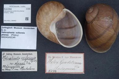 | Keywords: Naturalis Biodiversity Center - ZMA.MOLL.388983 - Helicophanta oviformis phenax (Pilsbry, 1890) - Acavidae - Mollusc shell.jpeg artwork Dimensions artwork Document type Acavidae subfamily Acavinae Helicophanta Individual count Infraspecific epithet phenax Infraspecific rank Institution Naturalis Kind of unit artwork Kind of unit specimen shell Life stage Medium artwork Nomenclatural code Source institute Rijksmuseum van Natuurlijke Historie Leiden Scale the width of the text on the species/QR-code label is 38 mm Occurrence ID page Other fields Other versions artwork Permission license Naturalis donation CC-0 Mollusca Publication location Scientific name Helicophanta oviformis phenax Pilsbry 1890 Scientific name authorship Pilsbry 1890 Source url http //bioportal naturalis nl Specific epithet oviformis State or province Subject keywords artwork Subject keywords publication Title artwork Title publication Type status Uploaded with GWToolset Naturalis_Biodiversity_Center_-_ZMA MOLL 388983_-_Helicophanta_oviformis_phenax_ Pilsbry _1890 _-_Acavidae_-_Mollusc_shell http //medialib naturalis nl/file/id/ZMA MOLL 388983/format/large Molluscs at Naturalis from the Zoölogisch Museum Amsterdam Media donated by Naturalis Biodiversity Center Helicophanta oviformis Helicophanta |
