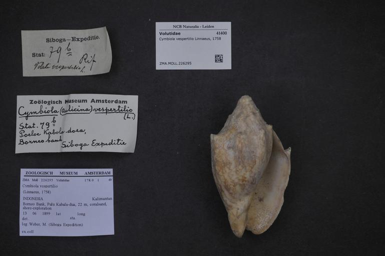 | Keywords: Naturalis Biodiversity Center - ZMA.MOLL.226295 - Cymbiola vespertilio Linnaeus, 1758 - Volutidae - Mollusc shell.jpeg artwork Dimensions artwork Document type Volutidae Cymbiola Individual count Infraspecific epithet Infraspecific rank Institution Naturalis Kind of unit artwork Kind of unit specimen shell Life stage Medium artwork Nomenclatural code Scale the width of the text on the species/QR-code label is 38 mm Occurrence ID page Neogastropoda Other fields Other versions artwork Permission license Naturalis donation CC-0 Mollusca Publication location Scientific name Cymbiola vespertilio Linnaeus 1758 Scientific name authorship Linnaeus 1758 Source url http //bioportal naturalis nl Specific epithet vespertilio State or province Subject keywords artwork Subject keywords publication Title artwork Title publication Type status Uploaded with GWToolset Naturalis_Biodiversity_Center_-_ZMA MOLL 226295_-_Cymbiola_vespertilio_Linnaeus _1758_-_Volutidae_-_Mollusc_shell http //medialib naturalis nl/file/id/ZMA MOLL 226295/format/large Media donated by Naturalis Biodiversity Center Molluscs at Naturalis from the Zoölogisch Museum Amsterdam Cymbiola vespertilio Cymbiola |