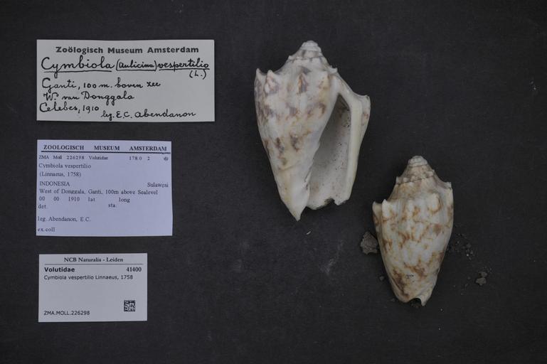 | Keywords: Naturalis Biodiversity Center - ZMA.MOLL.226298 - Cymbiola vespertilio Linnaeus, 1758 - Volutidae - Mollusc shell.jpeg artwork Dimensions artwork Document type Volutidae Cymbiola Individual count Infraspecific epithet Infraspecific rank Institution Naturalis Kind of unit artwork Kind of unit specimen shell Life stage Medium artwork Nomenclatural code Scale the width of the text on the species/QR-code label is 38 mm Occurrence ID page Neogastropoda Other fields Other versions artwork Permission license Naturalis donation CC-0 Mollusca Publication location Scientific name Cymbiola vespertilio Linnaeus 1758 Scientific name authorship Linnaeus 1758 Source url http //bioportal naturalis nl Specific epithet vespertilio State or province Subject keywords artwork Subject keywords publication Title artwork Title publication Type status Uploaded with GWToolset Naturalis_Biodiversity_Center_-_ZMA MOLL 226298_-_Cymbiola_vespertilio_Linnaeus _1758_-_Volutidae_-_Mollusc_shell http //medialib naturalis nl/file/id/ZMA MOLL 226298/format/large Media donated by Naturalis Biodiversity Center Molluscs at Naturalis from the Zoölogisch Museum Amsterdam Cymbiola vespertilio Cymbiola |