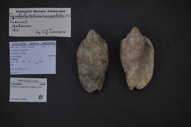 | Keywords: Naturalis Biodiversity Center - ZMA.MOLL.226381 - Cymbiola vespertilio Linnaeus, 1758 - Volutidae - Mollusc shell.jpeg artwork Dimensions artwork Document type Volutidae Cymbiola Individual count Infraspecific epithet Infraspecific rank Institution Naturalis Kind of unit artwork Kind of unit specimen shell Life stage Medium artwork Nomenclatural code Scale the width of the text on the species/QR-code label is 38 mm Occurrence ID page Neogastropoda Other fields Other versions artwork Permission license Naturalis donation CC-0 Mollusca Publication location Scientific name Cymbiola vespertilio Linnaeus 1758 Scientific name authorship Linnaeus 1758 Source url http //bioportal naturalis nl Specific epithet vespertilio State or province Subject keywords artwork Subject keywords publication Title artwork Title publication Type status Uploaded with GWToolset Naturalis_Biodiversity_Center_-_ZMA MOLL 226381_-_Cymbiola_vespertilio_Linnaeus _1758_-_Volutidae_-_Mollusc_shell http //medialib naturalis nl/file/id/ZMA MOLL 226381/format/large Media donated by Naturalis Biodiversity Center Molluscs at Naturalis from the Zoölogisch Museum Amsterdam Cymbiola vespertilio Cymbiola |