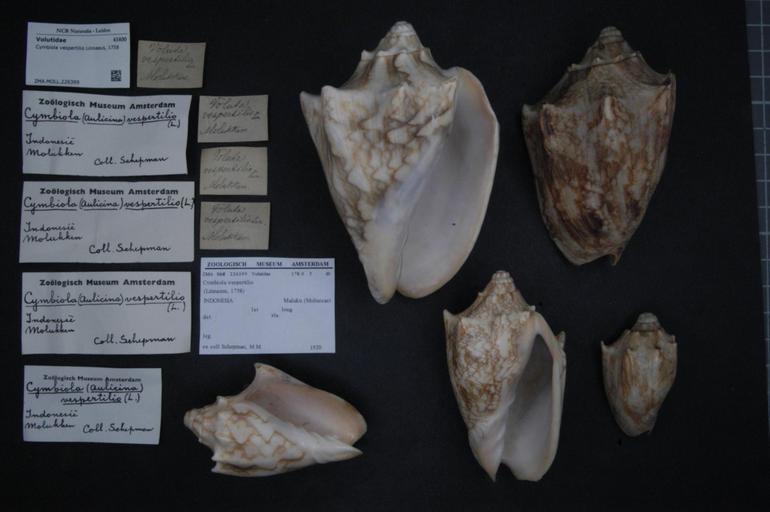 | Keywords: Naturalis Biodiversity Center - ZMA.MOLL.226399 - Cymbiola vespertilio Linnaeus, 1758 - Volutidae - Mollusc shell.jpeg artwork Dimensions artwork Document type Volutidae Cymbiola Individual count Infraspecific epithet Infraspecific rank Institution Naturalis Kind of unit artwork Kind of unit specimen shell Life stage Medium artwork Nomenclatural code Scale the width of the text on the species/QR-code label is 38 mm Occurrence ID page Neogastropoda Other fields Other versions artwork Permission license Naturalis donation CC-0 Mollusca Publication location Scientific name Cymbiola vespertilio Linnaeus 1758 Scientific name authorship Linnaeus 1758 Source url http //bioportal naturalis nl Specific epithet vespertilio State or province Subject keywords artwork Subject keywords publication Title artwork Title publication Type status Uploaded with GWToolset Naturalis_Biodiversity_Center_-_ZMA MOLL 226399_-_Cymbiola_vespertilio_Linnaeus _1758_-_Volutidae_-_Mollusc_shell http //medialib naturalis nl/file/id/ZMA MOLL 226399/format/large Media donated by Naturalis Biodiversity Center Molluscs at Naturalis from the Zoölogisch Museum Amsterdam Cymbiola vespertilio Cymbiola |
