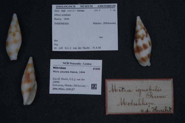 | Keywords: Naturalis Biodiversity Center - ZMA.MOLL.104127 - Mitra ustulata Reeve, 1844 - Mitridae - Mollusc shell.jpeg artwork Dimensions artwork Document type Mitridae subfamily Mitrinae Mitra Individual count Infraspecific epithet Infraspecific rank Institution Naturalis Kind of unit artwork Kind of unit specimen shell Life stage Indonesia Maluku Moluccas Medium artwork Nomenclatural code Collection remarks Moll Scale the width of the text on the species/QR-code label is 38 mm Occurrence ID page Neogastropoda Other fields Other versions artwork Permission license Naturalis donation CC-0 Mollusca Publication location Scientific name Mitra ustulata Reeve 1844 Scientific name authorship Reeve 1844 Source url http //bioportal naturalis nl Specific epithet ustulata State or province Maluku Moluccas Subject keywords artwork Subject keywords publication Title artwork Title publication Type status Uploaded with GWToolset Naturalis_Biodiversity_Center_-_ZMA MOLL 104127_-_Mitra_ustulata_Reeve _1844_-_Mitridae_-_Mollusc_shell http //medialib naturalis nl/file/id/ZMA MOLL 104127/format/large Media donated by Naturalis Biodiversity Center Molluscs at Naturalis from the Zoölogisch Museum Amsterdam Mitra ustulata |