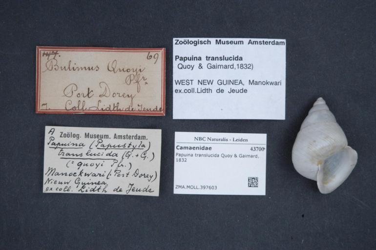 | Keywords: Naturalis Biodiversity Center - ZMA.MOLL.397603 - Papuina translucida Quoy & Gaimard, 1832 - Camaenidae - Mollusc shell.jpeg artwork Dimensions artwork Document type Camaenidae subfamily Papuininae Papuina Individual count Infraspecific epithet Infraspecific rank Institution Naturalis Kind of unit artwork Kind of unit specimen shell Life stage Medium artwork Nomenclatural code Source institute Rijksmuseum van Natuurlijke Historie Leiden Scale the width of the text on the species/QR-code label is 38 mm Occurrence ID page Other fields Other versions artwork Permission license Naturalis donation CC-0 Mollusca Publication location Scientific name Papuina translucida Quoy Gaimard 1832 Scientific name authorship Quoy Gaimard 1832 Source url http //bioportal naturalis nl Specific epithet translucida State or province Subject keywords artwork Subject keywords publication Title artwork Title publication Type status Uploaded with GWToolset Naturalis_Biodiversity_Center_-_ZMA MOLL 397603_-_Papuina_translucida_Quoy_ _Gaimard _1832_-_Camaenidae_-_Mollusc_shell http //medialib naturalis nl/file/id/ZMA MOLL 397603/format/large Molluscs at Naturalis from the Zoölogisch Museum Amsterdam Media donated by Naturalis Biodiversity Center Papuina translucida Papuina |