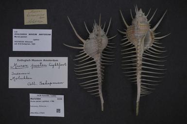 | Keywords: Naturalis Biodiversity Center - ZMA.MOLL.27022 - Murex pecten pecten Lightfoot, 1786 - Muricidae - Mollusc shell.jpeg artwork Dimensions artwork Document type Muricidae subfamily Muricinae Murex Individual count Infraspecific epithet pecten Infraspecific rank Institution Naturalis Kind of unit artwork Kind of unit specimen shell Life stage Indonesia; Moluccas Medium artwork Nomenclatural code Scale the width of the text on the species/QR-code label is 38 mm Occurrence ID page Neogastropoda Other fields Other versions artwork Permission license Naturalis donation CC-0 Mollusca Publication location Scientific name Murex pecten pecten Lightfoot 1786 Scientific name authorship Lightfoot 1786 Source url http //bioportal naturalis nl Specific epithet pecten State or province Moluccas Subject keywords artwork Subject keywords publication Title artwork Title publication Type status Uploaded with GWToolset Naturalis_Biodiversity_Center_-_ZMA MOLL 27022_-_Murex_pecten_pecten_Lightfoot _1786_-_Muricidae_-_Mollusc_shell http //medialib naturalis nl/file/id/ZMA MOLL 27022/format/large Media donated by Naturalis Biodiversity Center Molluscs at Naturalis from the Zoölogisch Museum Amsterdam Murex pecten |