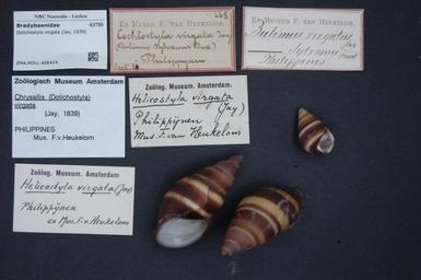 | Keywords: Naturalis Biodiversity Center - ZMA.MOLL.408424 - Dolichostyla virgata (Jay, 1839) - Bradybaenidae - Mollusc shell.jpeg artwork Dimensions artwork Document type Bradybaenidae Dolichostyla Individual count Infraspecific epithet Infraspecific rank Institution Naturalis Kind of unit artwork Kind of unit specimen shell Life stage Medium artwork Nomenclatural code Source institute Zoölogisch Museum Amsterdam Scale the width of the text on the species/QR-code label is 38 mm Occurrence ID page Other fields Other versions artwork Permission license Naturalis donation CC-0 Mollusca Publication location Scientific name Dolichostyla virgata Jay 1839 Scientific name authorship Jay 1839 Source url http //bioportal naturalis nl Specific epithet virgata State or province Subject keywords artwork Subject keywords publication Title artwork Title publication Type status Uploaded with GWToolset Naturalis_Biodiversity_Center_-_ZMA MOLL 408424_-_Dolichostyla_virgata_ Jay _1839 _-_Bradybaenidae_-_Mollusc_shell http //medialib naturalis nl/file/id/ZMA MOLL 408424/format/large Molluscs at Naturalis from the Zoölogisch Museum Amsterdam Media donated by Naturalis Biodiversity Center Dolichostyla virgata Dolichostyla |
