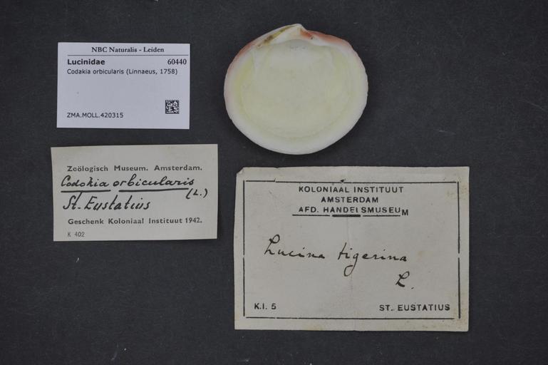 | Keywords: Naturalis Biodiversity Center - ZMA.MOLL.420315 - Codakia orbicularis (Linnaeus, 1758) - Lucinidae - Mollusc shell.jpeg artwork Dimensions artwork Document type Lucinidae subfamily Lucininae Codakia Individual count Infraspecific epithet Infraspecific rank Institution Naturalis Kind of unit artwork Kind of unit specimen shell Life stage Medium artwork Nomenclatural code Source institute Zoölogisch Museum Amsterdam Scale the width of the text on the species/QR-code label is 38 mm Occurrence ID page Other fields Other versions artwork Permission license Naturalis donation CC-0 Mollusca Publication location Scientific name Codakia orbicularis Linnaeus 1758 Scientific name authorship Linnaeus 1758 Source url http //bioportal naturalis nl Specific epithet orbicularis State or province Subject keywords artwork Subject keywords publication Title artwork Title publication Type status Uploaded with GWToolset Naturalis_Biodiversity_Center_-_ZMA MOLL 420315_-_Codakia_orbicularis_ Linnaeus _1758 _-_Lucinidae_-_Mollusc_shell http //medialib naturalis nl/file/id/ZMA MOLL 420315/format/large Molluscs at Naturalis from the Zoölogisch Museum Amsterdam Media donated by Naturalis Biodiversity Center Codakia orbicularis Codakia |