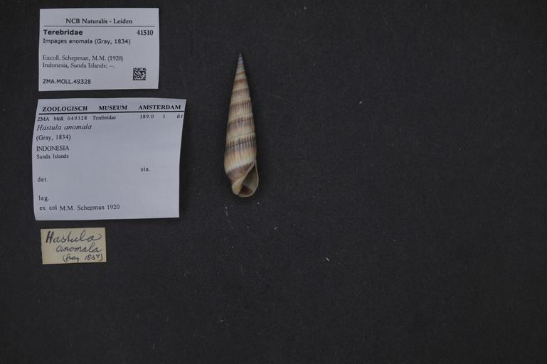 | Keywords: Naturalis Biodiversity Center - ZMA.MOLL.49328 - Impages anomala (Gray, 1834) - Terebridae - Mollusc shell.jpeg artwork Dimensions artwork Document type Terebridae Impages Individual count Infraspecific epithet Infraspecific rank Institution Naturalis Kind of unit artwork Kind of unit specimen shell Life stage Indonesia Sunda Islands Medium artwork Nomenclatural code Collection remarks Moll Source institute Zoölogisch Museum Amsterdam Scale the width of the text on the species/QR-code label is 38 mm Occurrence ID page Other fields Other versions artwork Permission license Naturalis donation CC-0 Mollusca Publication location Scientific name Impages anomala Gray 1834 Scientific name authorship Gray 1834 Source url http //bioportal naturalis nl Specific epithet anomala State or province Subject keywords artwork Subject keywords publication Title artwork Title publication Type status Uploaded with GWToolset Naturalis_Biodiversity_Center_-_ZMA MOLL 49328_-_Impages_anomala_ Gray _1834 _-_Terebridae_-_Mollusc_shell http //medialib naturalis nl/file/id/ZMA MOLL 49328/format/large Molluscs at Naturalis from the Zoölogisch Museum Amsterdam Media donated by Naturalis Biodiversity Center Impages anomala Impages |