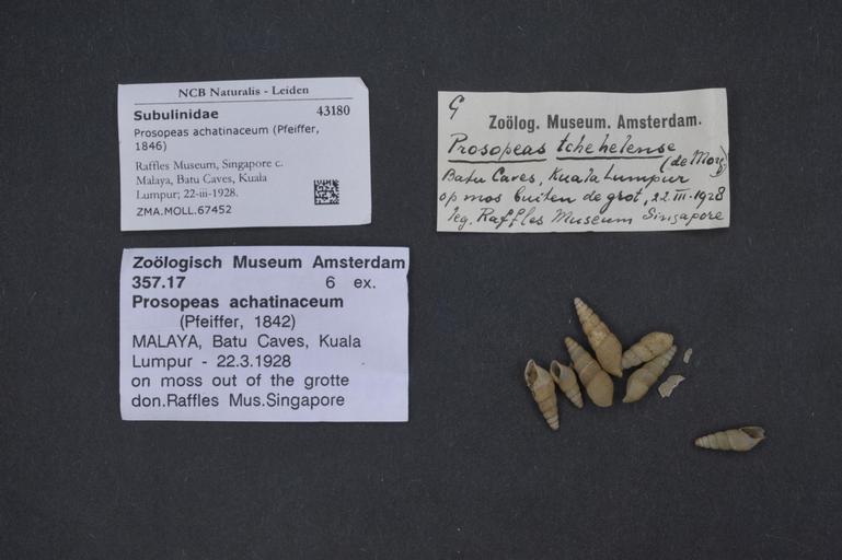 | Keywords: Naturalis Biodiversity Center - ZMA.MOLL.67452 - Prosopeas achatinaceum (Pfeiffer, 1846) - Subulinidae - Mollusc shell.jpeg artwork Dimensions artwork Document type Subulinidae subfamily Subulininae Prosopeas Individual count Infraspecific epithet Infraspecific rank Institution Naturalis Kind of unit artwork Kind of unit specimen shell Life stage Malaya Batu Caves Kuala Lumpur; 22-iii-1928 Medium artwork Nomenclatural code Source institute Zoölogisch Museum Amsterdam Scale the width of the text on the species/QR-code label is 38 mm Occurrence ID page Other fields Other versions artwork Permission license Naturalis donation CC-0 Mollusca Publication location Scientific name Prosopeas achatinaceum Pfeiffer 1846 Scientific name authorship Pfeiffer 1846 Source url http //bioportal naturalis nl Specific epithet achatinaceum State or province Subject keywords artwork Subject keywords publication Title artwork Title publication Type status Uploaded with GWToolset Naturalis_Biodiversity_Center_-_ZMA MOLL 67452_-_Prosopeas_achatinaceum_ Pfeiffer _1846 _-_Subulinidae_-_Mollusc_shell http //medialib naturalis nl/file/id/ZMA MOLL 67452/format/large Molluscs at Naturalis from the Zoölogisch Museum Amsterdam Media donated by Naturalis Biodiversity Center Prosopeas achatinaceum Prosopeas |