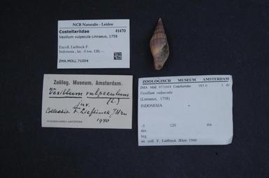 | Keywords: Naturalis Biodiversity Center - ZMA.MOLL.71004 - Vexillum vulpecula (Linnaeus, 1758) - Costellariidae - Mollusc shell.jpeg artwork Dimensions artwork Document type Costellariidae Vexillum Individual count Infraspecific epithet Infraspecific rank Institution Naturalis Kind of unit artwork Kind of unit specimen shell Life stage Indonesia lat -5 lon 120 Medium artwork Nomenclatural code Collection remarks Moll Source institute Zoölogisch Museum Amsterdam Scale the width of the text on the species/QR-code label is 38 mm Occurrence ID page Neogastropoda Other fields Other versions artwork Permission license Naturalis donation CC-0 Mollusca Publication location Scientific name Vexillum vulpecula Linnaeus 1758 Scientific name authorship Linnaeus 1758 Source url http //bioportal naturalis nl Specific epithet vulpecula State or province Subject keywords artwork Subject keywords publication Title artwork Title publication Type status Uploaded with GWToolset Naturalis_Biodiversity_Center_-_ZMA MOLL 71004_-_Vexillum_vulpecula_ Linnaeus _1758 _-_Costellariidae_-_Mollusc_shell http //medialib naturalis nl/file/id/ZMA MOLL 71004/format/large Molluscs at Naturalis from the Zoölogisch Museum Amsterdam Media donated by Naturalis Biodiversity Center Vexillum vulpecula Vexillum |