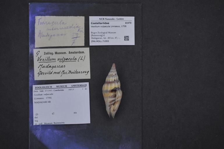 | Keywords: Naturalis Biodiversity Center - ZMA.MOLL.71993 - Vexillum vulpecula (Linnaeus, 1758) - Costellariidae - Mollusc shell.jpeg artwork Dimensions artwork Document type Costellariidae Vexillum Individual count Infraspecific epithet Infraspecific rank Institution Naturalis Kind of unit artwork Kind of unit specimen shell Life stage Madagascar lat -20 lon 47 Medium artwork Nomenclatural code Collection remarks Moll Source institute Zoölogisch Museum Amsterdam Scale the width of the text on the species/QR-code label is 38 mm Occurrence ID page Neogastropoda Other fields Other versions artwork Permission license Naturalis donation CC-0 Mollusca Publication location Scientific name Vexillum vulpecula Linnaeus 1758 Scientific name authorship Linnaeus 1758 Source url http //bioportal naturalis nl Specific epithet vulpecula State or province Subject keywords artwork Subject keywords publication Title artwork Title publication Type status Uploaded with GWToolset Naturalis_Biodiversity_Center_-_ZMA MOLL 71993_-_Vexillum_vulpecula_ Linnaeus _1758 _-_Costellariidae_-_Mollusc_shell http //medialib naturalis nl/file/id/ZMA MOLL 71993/format/large Molluscs at Naturalis from the Zoölogisch Museum Amsterdam Media donated by Naturalis Biodiversity Center Vexillum vulpecula Vexillum |