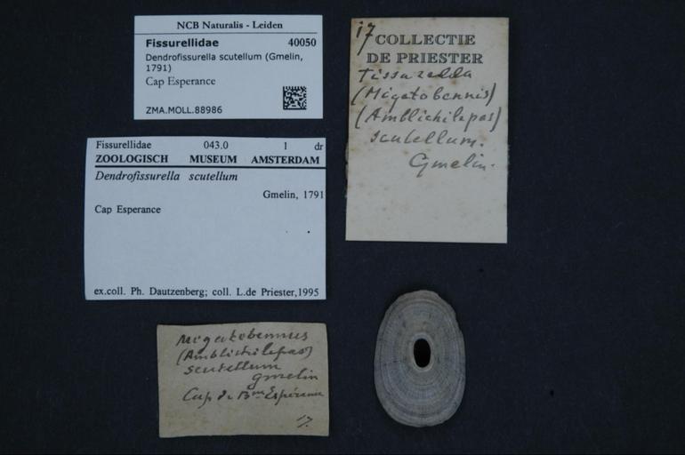 | Keywords: Naturalis Biodiversity Center - ZMA.MOLL.88986 - Dendrofissurella scutellum (Gmelin, 1791) - Fissurellidae - Mollusc shell.jpeg artwork Dimensions artwork Document type Fissurellidae Dendrofissurella Individual count Infraspecific epithet Infraspecific rank Institution Naturalis Kind of unit artwork Kind of unit specimen shell Life stage Cap Esperance Medium artwork Nomenclatural code Source institute Zoölogisch Museum Amsterdam Scale the width of the text on the species/QR-code label is 38 mm Occurrence ID page Other fields Other versions artwork Permission license Naturalis donation CC-0 Mollusca Publication location Scientific name Dendrofissurella scutellum Gmelin 1791 Scientific name authorship Gmelin 1791 Source url http //bioportal naturalis nl Specific epithet scutellum State or province Subject keywords artwork Subject keywords publication Title artwork Title publication Type status Uploaded with GWToolset Naturalis_Biodiversity_Center_-_ZMA MOLL 88986_-_Dendrofissurella_scutellum_ Gmelin _1791 _-_Fissurellidae_-_Mollusc_shell http //medialib naturalis nl/file/id/ZMA MOLL 88986/format/large Molluscs at Naturalis from the Zoölogisch Museum Amsterdam Media donated by Naturalis Biodiversity Center Dendrofissurella scutellum Dendrofissurella |