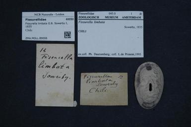 | Keywords: Naturalis Biodiversity Center - ZMA.MOLL.89006 - Fissurella limbata Sowerby, 1835 - Fissurellidae - Mollusc shell.jpeg artwork Dimensions artwork Document type Fissurellidae subfamily Fissurellinae Fissurella Individual count Infraspecific epithet Infraspecific rank Institution Naturalis Kind of unit artwork Kind of unit specimen shell Life stage Chile Medium artwork Nomenclatural code Source institute Zoölogisch Museum Amsterdam Scale the width of the text on the species/QR-code label is 38 mm Occurrence ID page Other fields Other versions artwork Permission license Naturalis donation CC-0 Mollusca Publication location Scientific name Fissurella limbata Sowerby 1835 Scientific name authorship Sowerby 1835 Source url http //bioportal naturalis nl Specific epithet limbata State or province Subject keywords artwork Subject keywords publication Title artwork Title publication Type status Uploaded with GWToolset Naturalis_Biodiversity_Center_-_ZMA MOLL 89006_-_Fissurella_limbata_Sowerby _1835_-_Fissurellidae_-_Mollusc_shell http //medialib naturalis nl/file/id/ZMA MOLL 89006/format/large Molluscs at Naturalis from the Zoölogisch Museum Amsterdam Media donated by Naturalis Biodiversity Center Fissurella limbata Fissurella |