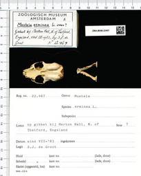 | Keywords: Naturalis Biodiversity Center - ZMA.MAM.22467 pal - Mustela erminea Linnaeus - skull.jpeg artwork Dimensions artwork Document type Mustela Individual count 1 Infraspecific epithet Infraspecific rank Institution Naturalis Kind of unit artwork Kind of unit specimen skull Life stage UNITED KINGDOM Thetford Merton Hall Medium artwork Nomenclatural code Occurrence ID page Other fields Other versions artwork Permission license Naturalis donation CC-0 Publication location Scientific name Mustela erminea Linnaeus Scientific name authorship Linnaeus unknown Source url http //bioportal naturalis nl Specific epithet erminea State or province Subject keywords artwork Subject keywords publication Title artwork Title publication Type status Uploaded with GWToolset Naturalis_Biodiversity_Center_-_ZMA MAM 22467_pal_-_Mustela_erminea_Linnaeus_-_skull http //medialib naturalis nl/file/id/ZMA MAM 22467_pal/format/large Mammals at Naturalis from the Zoölogisch Museum Amsterdam Media donated by Naturalis Biodiversity Center Mustela erminea Mustela |