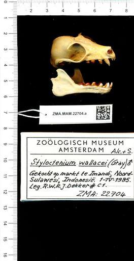 | Keywords: Naturalis Biodiversity Center - ZMA.MAM.22704.a lat - Styloctenium wallacei - skull.jpeg artwork Dimensions artwork Document type Styloctenium Individual count Infraspecific epithet Infraspecific rank Institution Naturalis Kind of unit artwork Kind of unit specimen skull Life stage Gekocht op markt te Imandi Noord-Sulawesi Indonesia Medium artwork Nomenclatural code Occurrence ID page Other fields Other versions artwork Permission license Naturalis donation CC-0 Publication location Scientific name Styloctenium wallacei Scientific name authorship male Source url http //bioportal naturalis nl Specific epithet wallacei State or province Subject keywords artwork Subject keywords publication Title artwork Title publication Type status Uploaded with GWToolset Naturalis_Biodiversity_Center_-_ZMA MAM 22704 a_lat_-_Styloctenium_wallacei_-_skull http //medialib naturalis nl/file/id/ZMA MAM 22704 a_lat/format/large Mammals at Naturalis from the Zoölogisch Museum Amsterdam Media donated by Naturalis Biodiversity Center Styloctenium wallacei Styloctenium |