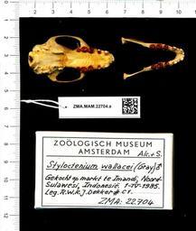 | Keywords: Naturalis Biodiversity Center - ZMA.MAM.22704.a pal - Styloctenium wallacei - skull.jpeg artwork Dimensions artwork Document type Styloctenium Individual count Infraspecific epithet Infraspecific rank Institution Naturalis Kind of unit artwork Kind of unit specimen skull Life stage Gekocht op markt te Imandi Noord-Sulawesi Indonesia Medium artwork Nomenclatural code Occurrence ID page Other fields Other versions artwork Permission license Naturalis donation CC-0 Publication location Scientific name Styloctenium wallacei Scientific name authorship male Source url http //bioportal naturalis nl Specific epithet wallacei State or province Subject keywords artwork Subject keywords publication Title artwork Title publication Type status Uploaded with GWToolset Naturalis_Biodiversity_Center_-_ZMA MAM 22704 a_pal_-_Styloctenium_wallacei_-_skull http //medialib naturalis nl/file/id/ZMA MAM 22704 a_pal/format/large Mammals at Naturalis from the Zoölogisch Museum Amsterdam Media donated by Naturalis Biodiversity Center Styloctenium wallacei Styloctenium |