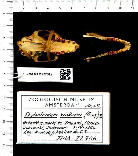| Keywords: Naturalis Biodiversity Center - ZMA.MAM.22706.a pal - Styloctenium wallacei - skull.jpeg artwork Dimensions artwork Document type Styloctenium Individual count Infraspecific epithet Infraspecific rank Institution Naturalis Kind of unit artwork Kind of unit specimen skull Life stage Gekocht op markt te Imandi Noord-Sulawesi Indonesia Medium artwork Nomenclatural code Occurrence ID page Other fields Other versions artwork Permission license Naturalis donation CC-0 Publication location Scientific name Styloctenium wallacei Scientific name authorship female Source url http //bioportal naturalis nl Specific epithet wallacei State or province Subject keywords artwork Subject keywords publication Title artwork Title publication Type status Uploaded with GWToolset Naturalis_Biodiversity_Center_-_ZMA MAM 22706 a_pal_-_Styloctenium_wallacei_-_skull http //medialib naturalis nl/file/id/ZMA MAM 22706 a_pal/format/large Mammals at Naturalis from the Zoölogisch Museum Amsterdam Media donated by Naturalis Biodiversity Center Styloctenium wallacei Styloctenium |