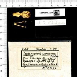 | Keywords: Naturalis Biodiversity Center - ZMA.MAM.52271 pal - Leptonycteris curasoae - skull.jpeg artwork Dimensions artwork Document type Leptonycteris Individual count 1 Infraspecific epithet Infraspecific rank Institution Naturalis Kind of unit artwork Kind of unit specimen skull Life stage Grot Plantage Noordkant CuraƧao Medium artwork Nomenclatural code Occurrence ID page Other fields Other versions artwork Permission license Naturalis donation CC-0 Publication location Scientific name Leptonycteris curasoae Scientific name authorship male Source url http //bioportal naturalis nl Specific epithet curasoae State or province Subject keywords artwork Subject keywords publication Title artwork Title publication Type status Uploaded with GWToolset Naturalis_Biodiversity_Center_-_ZMA MAM 52271_pal_-_Leptonycteris_curasoae_-_skull http //medialib naturalis nl/file/id/ZMA MAM 52271_pal/format/large Mammals at Naturalis from the Zoƶlogisch Museum Amsterdam Media donated by Naturalis Biodiversity Center Leptonycteris curasoae Leptonycteris |