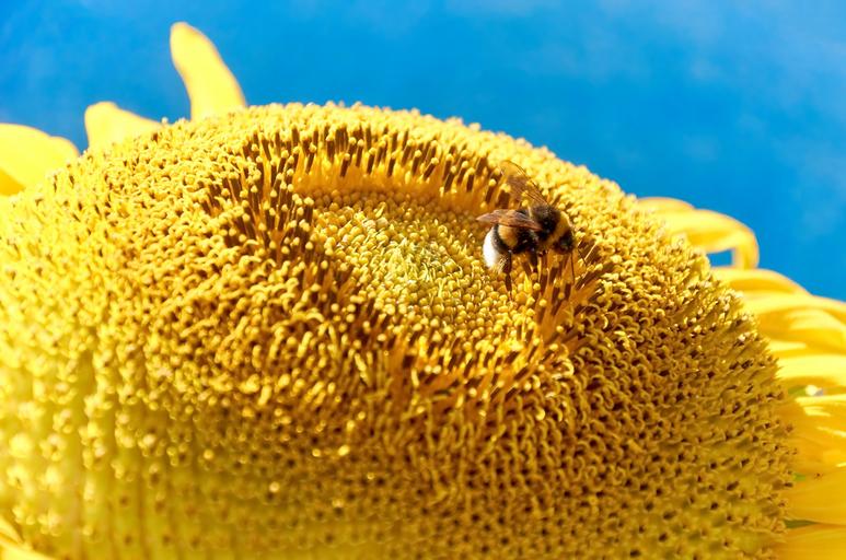 Keywords: nature sun flower summer blossom bloom flora yellow hummel wasp close plant withered faded flower nectar inseminate fertilize bee