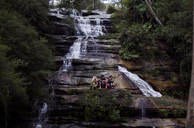 Keywords: nature waterfall stream creek rocks persons sittng relaxing group water landscape forest cascade green wild scenic flow jungle outdoor fresh splash