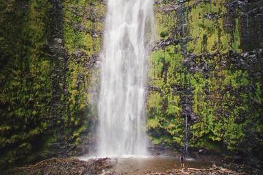 Keywords: nature waterfall water creek stream river huge gigantic high stone rock wall moss wet flora vegetation flow motion spray human person small little wild environment outdoor fresh pond splash