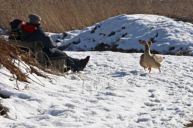 Keywords: nature winter snow animals animal geese migratory birds grey geese human click rest bench bank