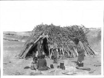 | Keywords: Navajo family at their hogan in Blue Canyon, ca.1900 (CHS-4733).jpg en <br> Navajo family at their hogan in Blue Canyon ca 1900 Photograph of Navajo family at their hogan in Blue Canyon ca 1900 The hogan which is constructed from tented rough-hewn timbers covered with leafy branches stands near the campfire around which various cooking instruments sit A man two women and three children are visible One of the women can be seen sitting near the campfire with a child to her left shading his eyes Another woman can be seen at right with a child to her left raising his left arm The man can be seen near the doorway of the hogan standing near a small girl The man wears a headband and has his hair pulled upwards He does not wear a shirt but rather has it draped over his shoulder Mountain ridges can be seen in the extreme background Call number CHS-4733 Photographer James George Wharton Filename CHS-4733 Coverage date circa 1892 Part of collection California Historical Society Collection 1860-1960 Type images Part of subcollection Title Insurance and Trust and C C Pierce Photography Collection 1860-1960 Repository name USC Libraries Special Collections Format glass plate negatives Microfiche number 1-174- Archival file chs_Volume98/CHS-4733 tiff Repository address Doheny Memorial Library Los Angeles CA 90089-0189 Geographic subject country USA Format aacr2 2 photographs glass photonegative photoprint b w ; 17 x 22 cm Rights Digitally reproduced by the USC Digital Library; From the California Historical Society Collection at the University of Southern California Subject adlf housing areas Project USC Accession number 4733 Repository email specol usc edu Identifying number unidentified no James-1113 Contributing entity California Historical Society Date created circa 1892 Publisher of the digital version University of Southern California Libraries Format aat photographic prints; photographs Legacy record ID chs-m17044; USC-1-1-1-13946 Access conditions Send requests to address or e-mail given Phone 213 821-2366; fax 213 740-2343 Subject file heading Indians -- Navajo Subject lcsh Indians of North America; Navajo Indians; Dwellings Subject Navajo Indians circa 1892 date created George Wharton James 1858 1923 http //digitallibrary usc edu/cdm/ref/collection/p15799coll65/id/17059 PD-old-70-1923 Images from USC Digital Library uploaded by Fæ Photographs by George Wharton James California Historical Society Collection 1860-1960 Glass plate negatives Historical photographs of Navajo people |
