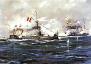 | Keywords: Naval Battle of Angamos 1879.jpg oil cm Museo Naval del Perú Callao Lima Colección Manuel Cisneros Sánchez Lima object history exhibition history credit line accession number place of creation Photographs of military flags of Peru Paintings of naval battles Naval ships of Peru Buques de la Guerra del Pacifico Battle of Angamos PD-Art |