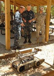 | Keywords: Naval Explosive Ordnance Disposal School student explains robots 120425-N-DA827-004.jpg en Ensign Marc Cardwell a student in the improvised explosive device division at Naval Explosive Ordnance Disposal School explains the importance of bomb robots to Rear Adm Clifford Sharpe chief operating office of Naval Education and Training Command during a tour The school located at Eglin Air Force Base Fla provides high-risk specialized basic and advanced EOD training to more than 2 200 U S and partner nation military and selected U S government personnel each year 2012-05-02 Petty Officer 2nd Class Elizabeth Allen https //www dvidshub net/image/570321 120425-N-DA827-004 2012-05-02 03 05 EGLIN AIR FORCE BASE FL US PD-USGov-Military-Navy Eglin Air Force Base Images from DoD uploaded by Fæ |