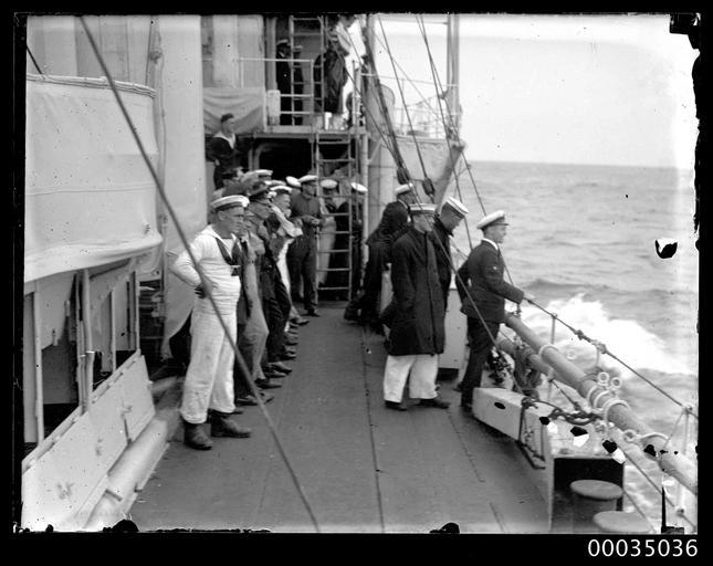 | Keywords: hood collection hoodcollection 35036 samuel j hood collection samueljhoodcollection hmas torrens hmastorrens torrens royal australian navy royalaustraliannavy navy naval vessel navalvessel sinking scuttled scuttling 1930 destroyer sydney sydney heads sydneyheads naval personnel navalpersonnel naval officers navalofficers sailors hmas anzac hmasanzac blackandwhite monochrome photo border outdoor black and white Having served in the Royal Australian Navy from 1916, latterly as a training platform for the Naval Reserve, HMAS TORRENS I was decommissioned and prepared as a target for Fleet Gunnery Practice. On 24 November 1930 Samuel J Hood, who was probably on board HMAS ANZAC, photographed the sinking of TORRENS off Sydney Heads. Royal Australian Navy officers and sailors are depicted here, probably on board ANZAC, witnessing the sinking. This photo is part of the Australian National Maritime Museum’s Samuel J. Hood Studio collection. Sam Hood (1872-1953) was a Sydney photographer with a passion for ships. His 60-year career spanned the romantic age of sail and two world wars. The photos in the collection were taken mainly in Sydney and Newcastle during the first half of the 20th century. The ANMM undertakes research and accepts public comments that enhance the information we hold about images in our collection. This record has been updated accordingly. Photographer: Samuel J. Hood Studio Collection Object no. 00035036 Having served in the Royal Australian Navy from 1916, latterly as a training platform for the Naval Reserve, HMAS TORRENS I was decommissioned and prepared as a target for Fleet Gunnery Practice. On 24 November 1930 Samuel J Hood, who was probably on board HMAS ANZAC, photographed the sinking of TORRENS off Sydney Heads. Royal Australian Navy officers and sailors are depicted here, probably on board ANZAC, witnessing the sinking. This photo is part of the Australian National Maritime Museum’s Samuel J. Hood Studio collection. Sam Hood (1872-1953) was a Sydney photographer with a passion for ships. His 60-year career spanned the romantic age of sail and two world wars. The photos in the collection were taken mainly in Sydney and Newcastle during the first half of the 20th century. The ANMM undertakes research and accepts public comments that enhance the information we hold about images in our collection. This record has been updated accordingly. Photographer: Samuel J. Hood Studio Collection Object no. 00035036 |
