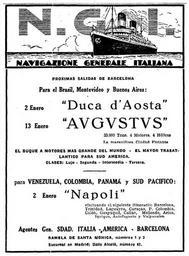 | Keywords: Navigazione-Generale-Italiana-1927.jpg it Navigazione Generale Italiana annuncio pubblicitario della partenza delle motonavi DUCA D'AOSTA e AUGUSTUS dal porto di Napoli il 2 e il 13 gennaio 1927 dirette in Venezuela Colombia Panamà e Sud Pacifico Agente Gen SDAD - Italia - America - Barcellona Rambla de Santa Monica 1 e 3 succursale a Madrid calle Alcalà 47 1927-12-29 La Vanguardia Barcelona 29 diciembre 1927 pag 10 Navigazione Generale Italiana PD-old La Vanguardia advertisements 1927 Advertisements in Spain 1927 Shipping line advertisements 1927 advertisements in Spain Navigazione Generale Italiana |