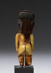| Keywords: Nazca - Female Effigy Figure - Walters 2009207 - Back.jpg Andean civilization is renowned for spectacular textiles that were at the heart of social politics and economics from earliest times The fiber arts permeated all facets of daily existence from clothing to protect the body to bridges spanning treacherous gorges The form materials quality and decorative imagery on clothing conveyed a person's social status or political affiliation and even recounted his or her specific accomplishments on behalf of the state This female figure originally was dressed in clothing appropriate to her meaning as an offering- perhaps a building dedication cache or ritual deposit at a huaca a sacred location where divine forces are concentrated Coastal Andean peoples were keen observers of the vast ocean world The Nasca in particular relied heavily on marine resources for food and materials for a variety of uses such as the whale tooth from which this captivating lady was carved The salty ocean and its unusual creatures constituted a dyadic opposition to the earth with its fresh waters The carving of a ritual figurine from the tooth of a gigantic marine creature certainly carried extra spiritual significance 200 BC-AD 500 Early Intermediate sperm whale tooth shell hair cm 7 62 2 7 2 38 accession number 2009 20 7 80162 Throckmorton Fine Arts New York date and mode of acquisition unknown John G Bourne 1990s by purchase Walters Art Museum Gift of John Bourne 2009 place of origin South Coast Walters Art Museum license Pre-Columbian art in the Walters Art Museum Nazca art Media contributed by the Walters Art Museum needs category review |
