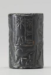 | Keywords: Near Eastern - Cylinder Seal with Enkidu Vanquishing the Bull of Heaven - Walters 42786 - Side A.jpg At the center of the depicted scene is a handled jug on a stand Flanking this motif on both sides is an animal contest motif with a bearded hero/bull-man in horned headdress battling a bull-man At the edge of the scene is a cuneiform inscription in two registers at the top and beneath it is a small four legged animal with a long tail that curls upward between 1970 1670 BC early Old Babylonian; Babylon I hematite cm 2 3 1 4 accession number 42 786 3746 Sadie Jones Mrs Henry Walters New York date and mode of acquisition unknown Sale Joseph Brummer New York 1941 Walters Art Museum 1941 by purchase Museum purchase 1941 Inscription place of origin Mesopotamia Walters Art Museum license Cylinder seals in the Walters Art Museum Art of the ancient Near East Media contributed by the Walters Art Museum needs category review |