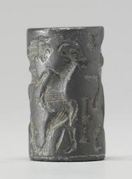 | Keywords: Near Eastern - Cylinder Seal with Four Beasts in Combat - Walters 42814 - Side C.jpg The scene on this seal depicts a lion attacking a horned quadruped A second horned quadruped is shown being attacked by a winged monster with talons Between these two sets of battling creatures is a small juglet suspended in the field There is a cuneiform inscription in two registers and above the registers is a disk with a star in it cradled in an inverted crescent between 1970 1670 BC early Old Babylonian; Babylon I hematite cm 2 1 2 accession number 42 814 27892 Sadie Jones Mrs Henry Walters New York date and mode of acquisition unknown Sale Joseph Brummer New York 1941 Walters Art Museum 1941 by purchase Museum purchase 1941 Inscription place of origin Mesopotamia Walters Art Museum license Cylinder seals in the Walters Art Museum Art of the ancient Near East Media contributed by the Walters Art Museum needs category review |
